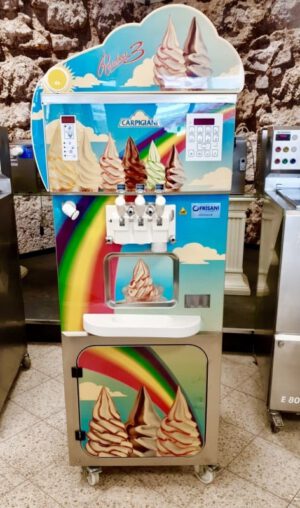 The original VERZIERTE soft ice cream of Carpigiani Rainbow 3 has immediately met with immediate approval, even among the usual consumers of traditional ice cream, which is offered in the two classic flavors plus the mixed. This soft ice cream is becoming increasingly popular when offered with a range of different flavors. The Rainbow 3 is a technically developed stand-alone soft ice cream machine that Carpigiani has realized to produce both the ice cream with one and two flavors with usual success, as well as the funny decorated ice cream preferred by the youth. In the upper part of the machine there are two preservation containers for the mix; in the central part there are the two horizontal cylinders from which – through the dispensing group – the ice cream portions are dispensed. The group is equipped with three levers that control three dispensing taps with a star-shaped dispensing opening to realize the ice cream cones with the characteristic sinuous shape. When the left lever is lowered, a classic soft ice cream with a flavor produced with the mix contained in the upper left tub (e.g., chocolate) emerges from the corresponding dispensing tap. Lowering the right lever will make a different flavor ice cream with the mix contained in the right tub (for example, vanilla). However, if you lower the middle lever, a nice ice cream cone with two flavors is prepared (for example, chocolate and vanilla). If you want to produce a beautiful decorated ice cream (e.g. strawberry), just press the corresponding button on the control panel and lower the right lever – the produced ice cream will be instantly decorated with one of the three colored fruit or cream flavored concentrates located in the three containers housed in the lower part of the machine. Thus, it is possible to obtain three different decorated ice cream portions (e.g. mango, strawberry, green apple).